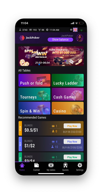 В JackPoker доступно два режима игры: на реальные деньги и на условные фишки, не имеющие никакой ценности. В лобби клиента вы увидите несколько форматов покера. Можно играть в классический кэш по правилам Холдема и Омахи (с 4 и 5 картами), либо в пуш-фолд, где возможны только два действия: фолд и олл-ин. Любители лотерейных турниров смогут сыграть в Спины, где призовой фонд формируется случайным образом. Джекпоты в таких турнирах достигают 1 млн долларов.