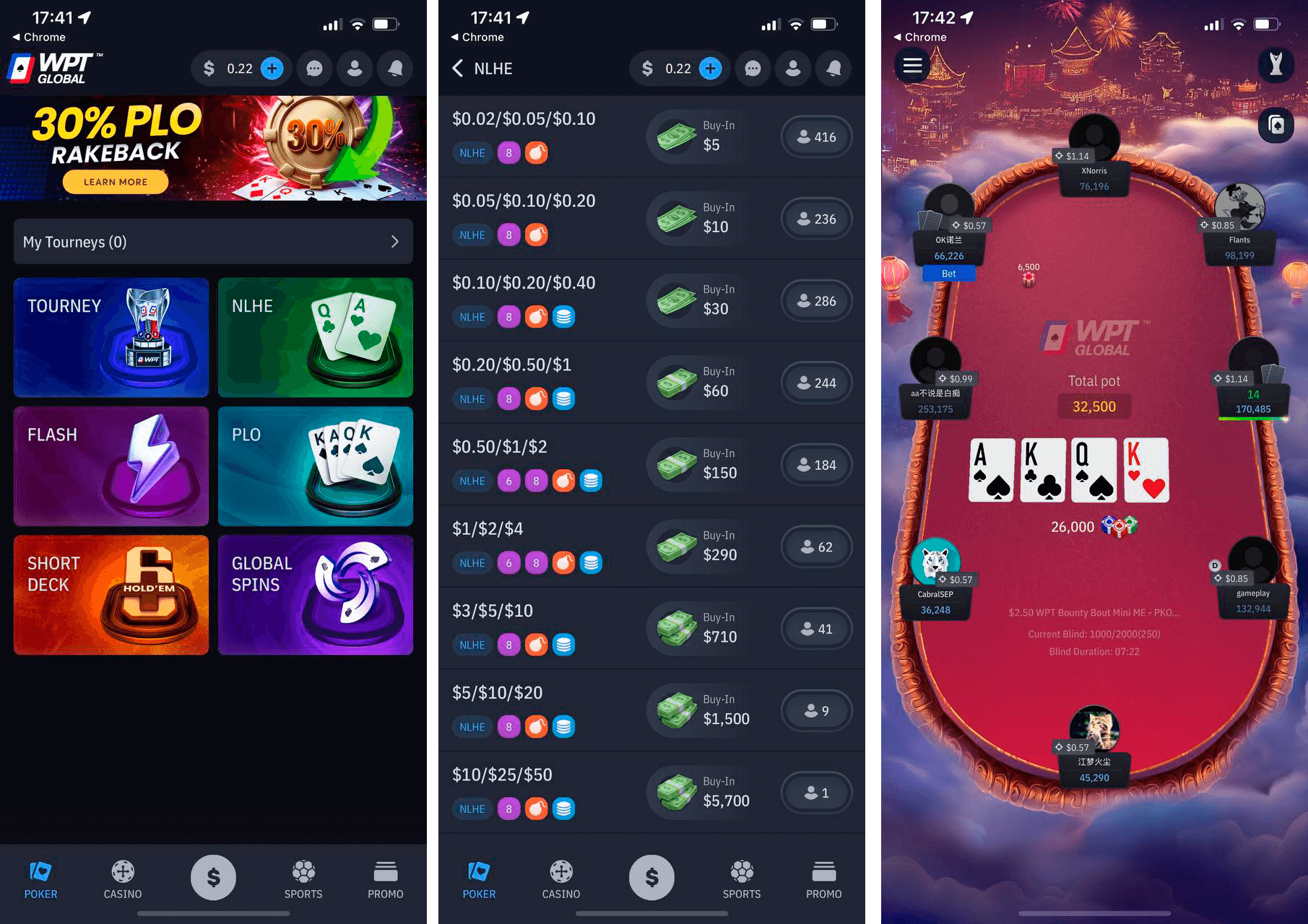 Быстрый покер в WPT Global называется Flash, и он представлен лишь двумя лимитами – 1/2/4 китайских юаня и 2/5/10 центов. В пиковое время на каждом лимите собирается по 120-150 игроков. В потлимитную Омаху играют на ставках от 1/2/4 центов до 50/100/200 долларов. Холдем с короткой колодой играется с анте в диапазоне от 1 цента до 50 долларов.
